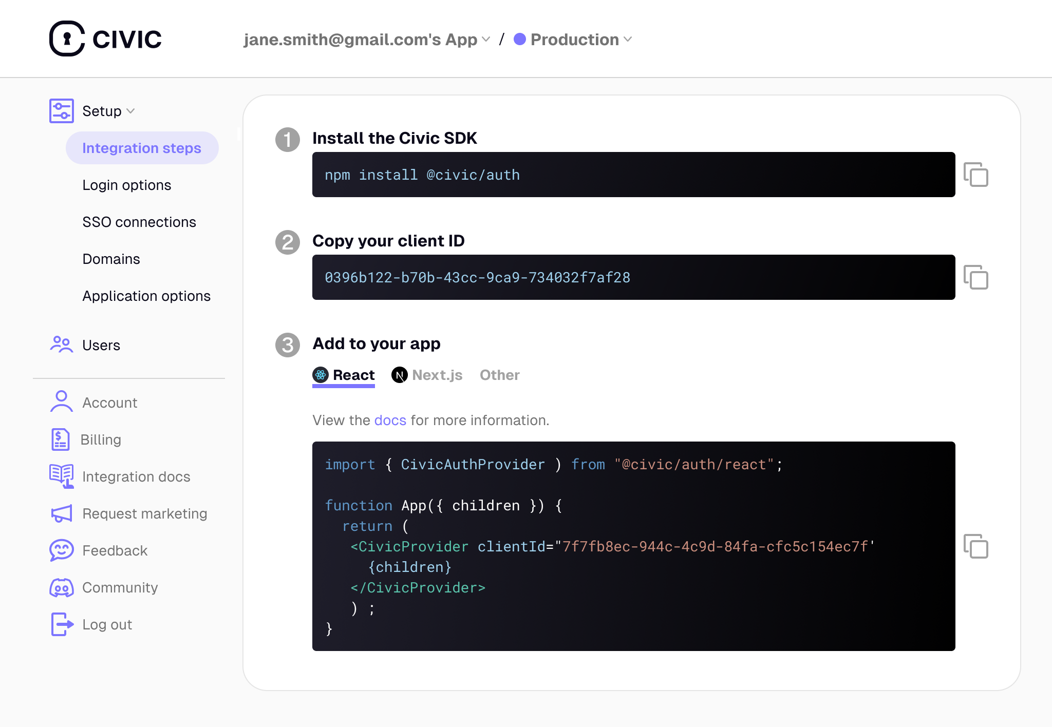 Sign up for Civic Auth in less than a minute at auth.civic.com to get your Client ID.